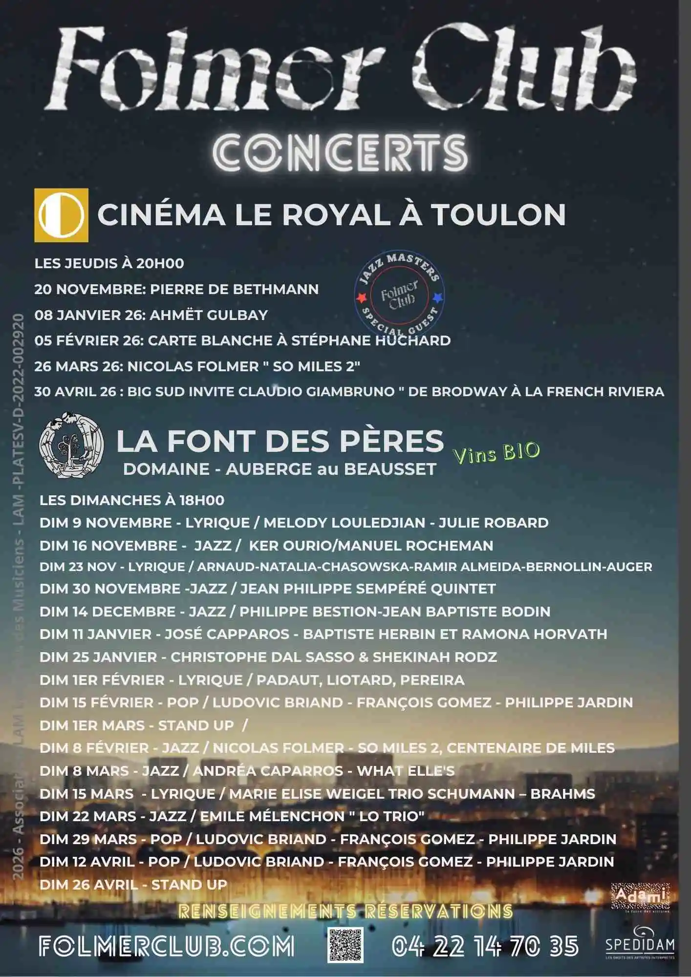 Nous aurons le plaisir de vous retrouver très prochainement au Cinéma Le Royal à Toulon, au Domaine de La Font des Pères, au Théâtre Jules Verne de Bandol, ainsi que dans les autres lieux partenaires qui participent à faire vivre cette aventure musicale.